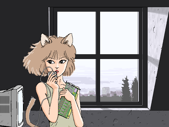 - 猫 A Cat neko2.gif (3KB) 会社で仕事中にこっそり描いた絵。640x350の画面モードで描いているので縦横比が変。 A picture I secretly drew while working at the office. The aspect ratio is incorrect because it is drawn in 640x350 screen mode. (1991)